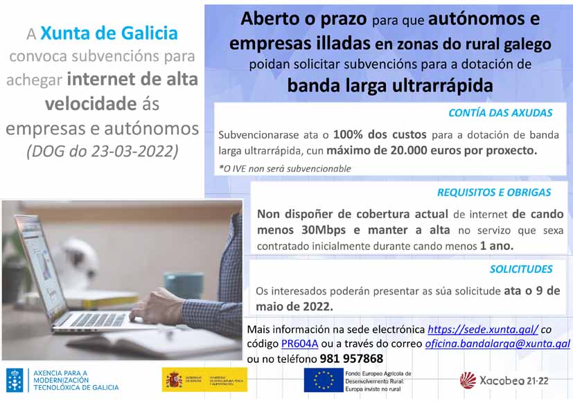 Dende o Concello da Guarda infórmase de que o próximo día 9 de maio rematará o prazo de solicitude das subvencións da Xunta de Galicia para a dotación de servizo de banda larga ultrarrápida a autónomos e empresas illadas en zonas do rural galego.