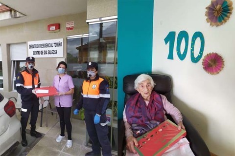 María Gregorio López vive no Geriátrico Residencial Tomiño (barrio da Salgosa). O día 16 de abril cumpriu 100 anos. Debido ao confinamento, tivo que celebrar o seu centenario sen a presenza dos seus tres fillos: Fermín, Jose M. e Mª Joaquina. A Concellería de Benestar Social, que dirixe Cristina Martínez, fíxolle chegar un pequeno agasallo (unha caixa de bombóns) a través de dous voluntarios de Protección Civil Tomiño, que tamén lle levaron unha tarxeta de felicitación, desexándolle que continúe con boa saúde, coma ata agora, e moito ánimo para sobrelevar estes momentos difíciles.