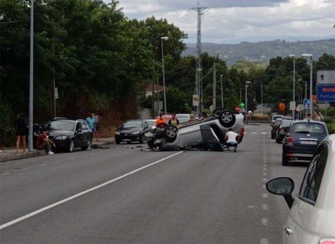 Unha persoa resultou ferida a causa dunha colisión entro dous turismos, un deles envorcado, na estrada que comunica os concellos de Gondomar e Tui.