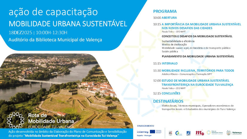 El Concello de Valença ha anunciado la realización de la acción de capacitación “Movilidad Urbana Sostenible” el próximo 18 de diciembre de 2025, una iniciativa integrada en el Plan de Comunicación y Sensibilización del proyecto transfronterizo “Movilidad Sostenible en la Eurociudad Tui–Valença”. La actividad tendrá lugar en el Auditorio de la Biblioteca Municipal de Valença y se enmarca dentro de la Semana Europea de la Movilidad 2025, dedicada este año al lema “Movilidad para Todos” y al mensaje oficial “Combina y Muévete”.