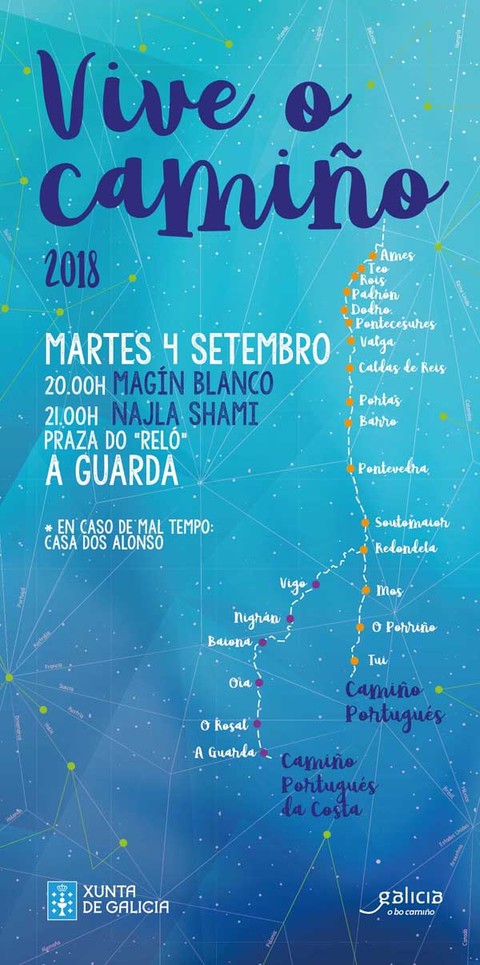 O vindeiro Martes día 4 de setembro de 2018 a Praza do Reló de A Guarda acollerá as actuacións de Magín Blanco e Najla Shami, enmarcadas no programa Vive o Camiño 2018 do Plan Director e Estratéxico do Camiño de Santiago en Galicia 2015-2021.