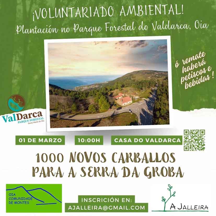 La CMVMC de Santa María de Oia y la Asociación A Jalleira organizan una jornada de reforestación el sábado 1 de marzo, donde se plantarán 1000 carballos en el Parque Forestal do Valdarca.