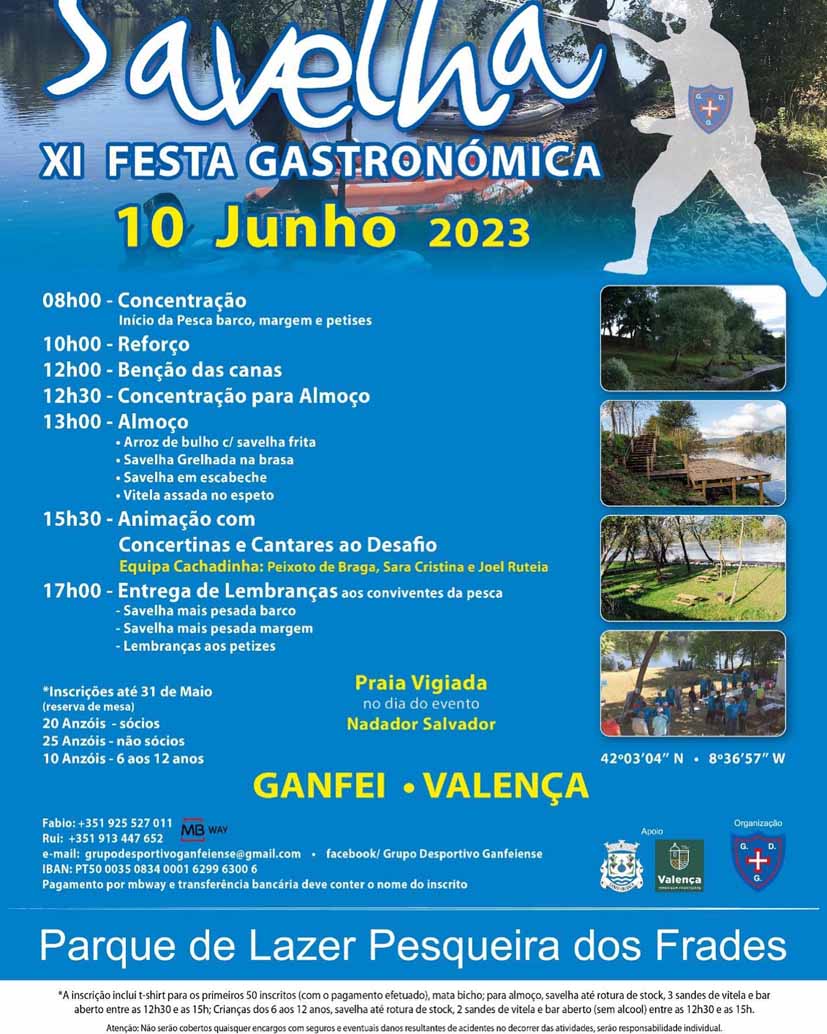 A XI Festa Gastronómica da Savelha realiza-se este sábado, 10 de junho, na Pesqueira dos Frades, em Ganfei. Arroz de bulho com Savelha frita, Savelha grelhada na brasa, Savelha em escabeche e Vitela assada no espeto compõem a oferta gastronómica deste evento.
