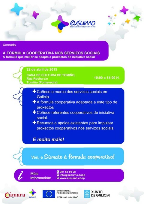 • O concello de Tomiño en colaboración coa Rede Eusumo organiza unha Xornada de promoción do cooperativismo nos servizos sociais tituladas "A fórmula cooperativa nos servizos sociais". Esta actividade está integrada no plan de actuación da rede para este ano 2015.