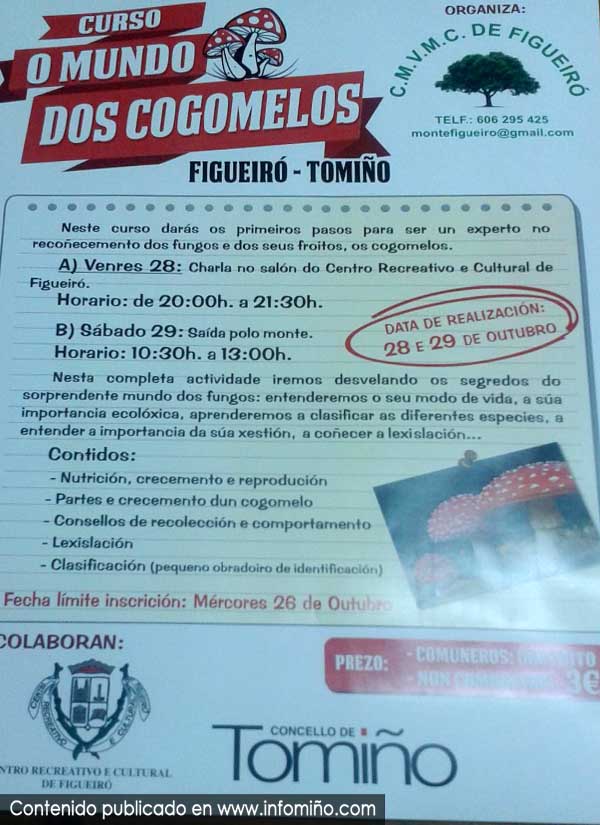A Comunidade de Montes en Man Común de Figueiró organiza unhas xornadas micolóxicas os vindeiros 28 e 29 de outubro. Estas consistirán nunha charla teórica o venres 28 de 20:00h. a 21:30h. no salón de actos do Centro Recreativo e Cultural de Figueiró, que se complementará cunha saída ó monte o sábado 29 de 10:30h. a 13:00h., co fin de poñer en práctica os coñecementos adquiridos.