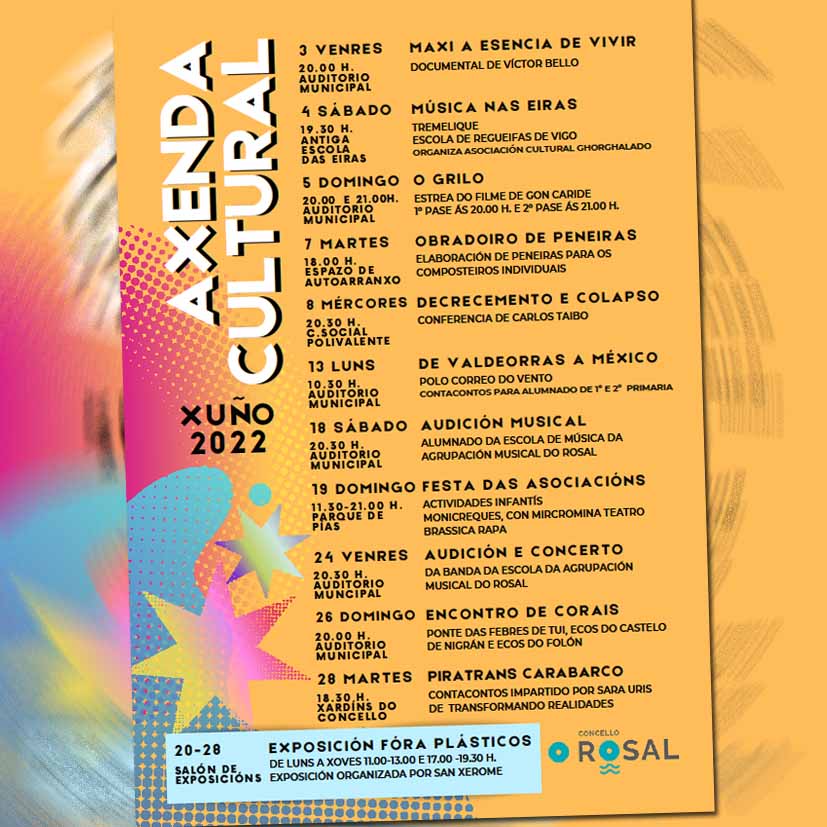 Entre as actividades programadas para este mes de xuño estarán un obradoiro de elaboración de peneiras para composteiros individuais (7 de xuño); unha conferencia de Carlos Taibo o día 8; o contacontos para alumnado de primaria ‘De Valdeorras a México’, da compañía Polo Correo do Vento (13 de xuño); a audición musical do alumnado da Escola de Música da Agrupación Musical do Rosal (18 de xuño) ou a primeira edición da Festa das Asociacións, adiada o pasado mes de maio por mor da choiva. Haberá ademais audición e concerto da Banda da Escola da Agrupación Musical do Rosal o venres 24, encontro de corais o domingo 26, contacontos nos xardíns do Concello o martes 28 e a exposición fotográfica ‘Fóra Plásticos’, organizada por San Xerome Emiliani.